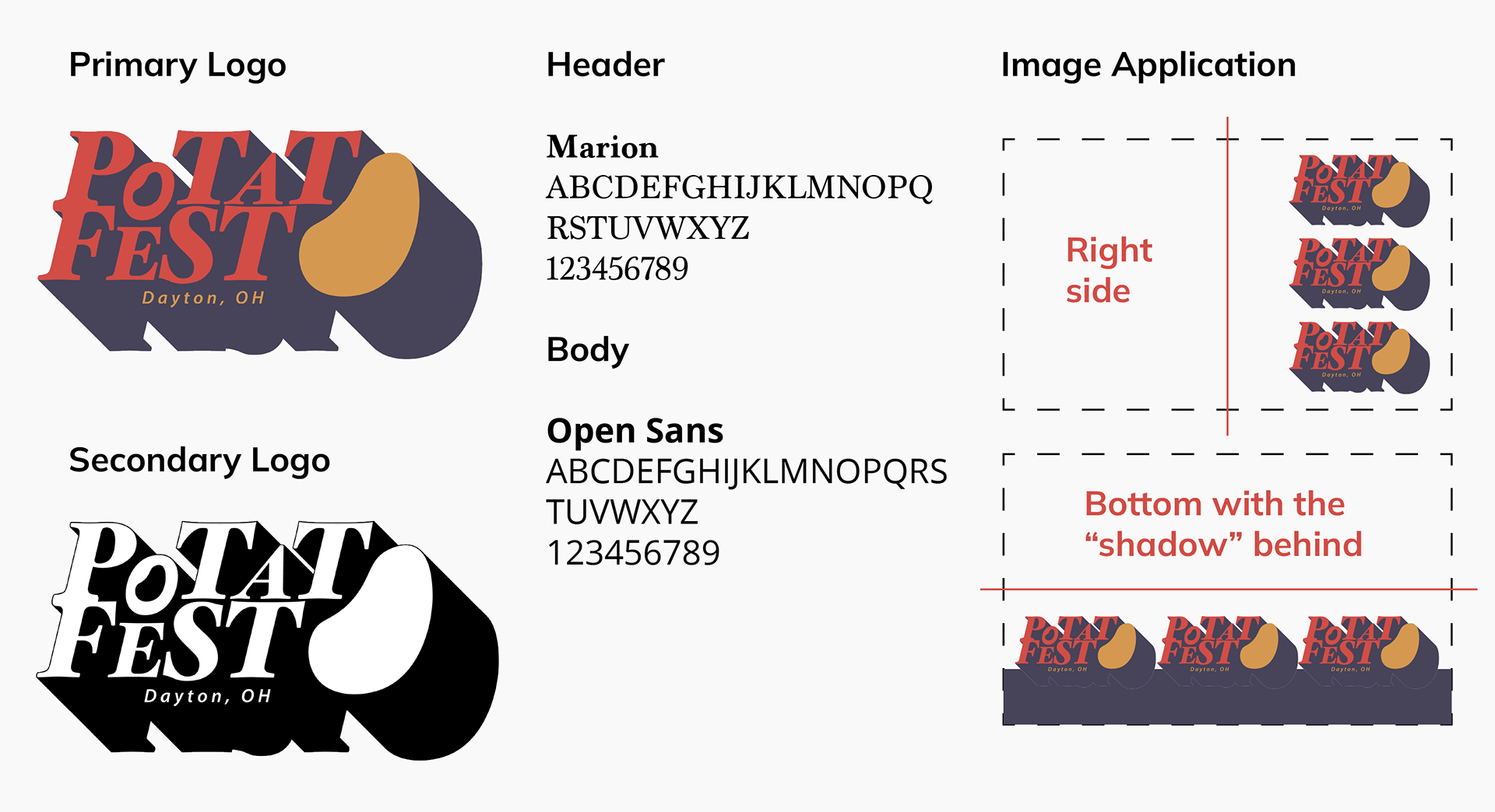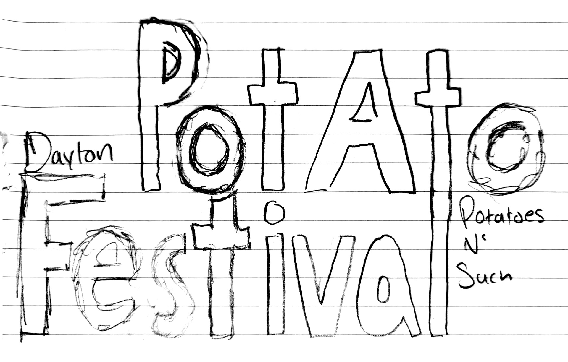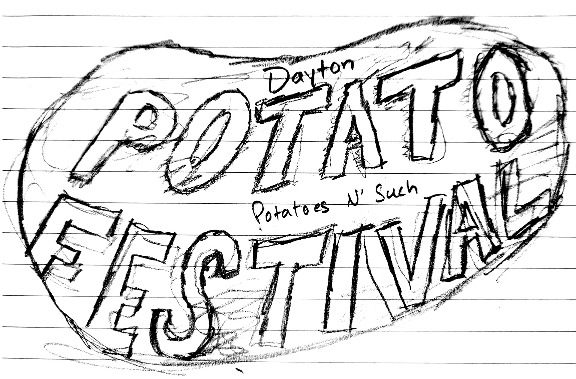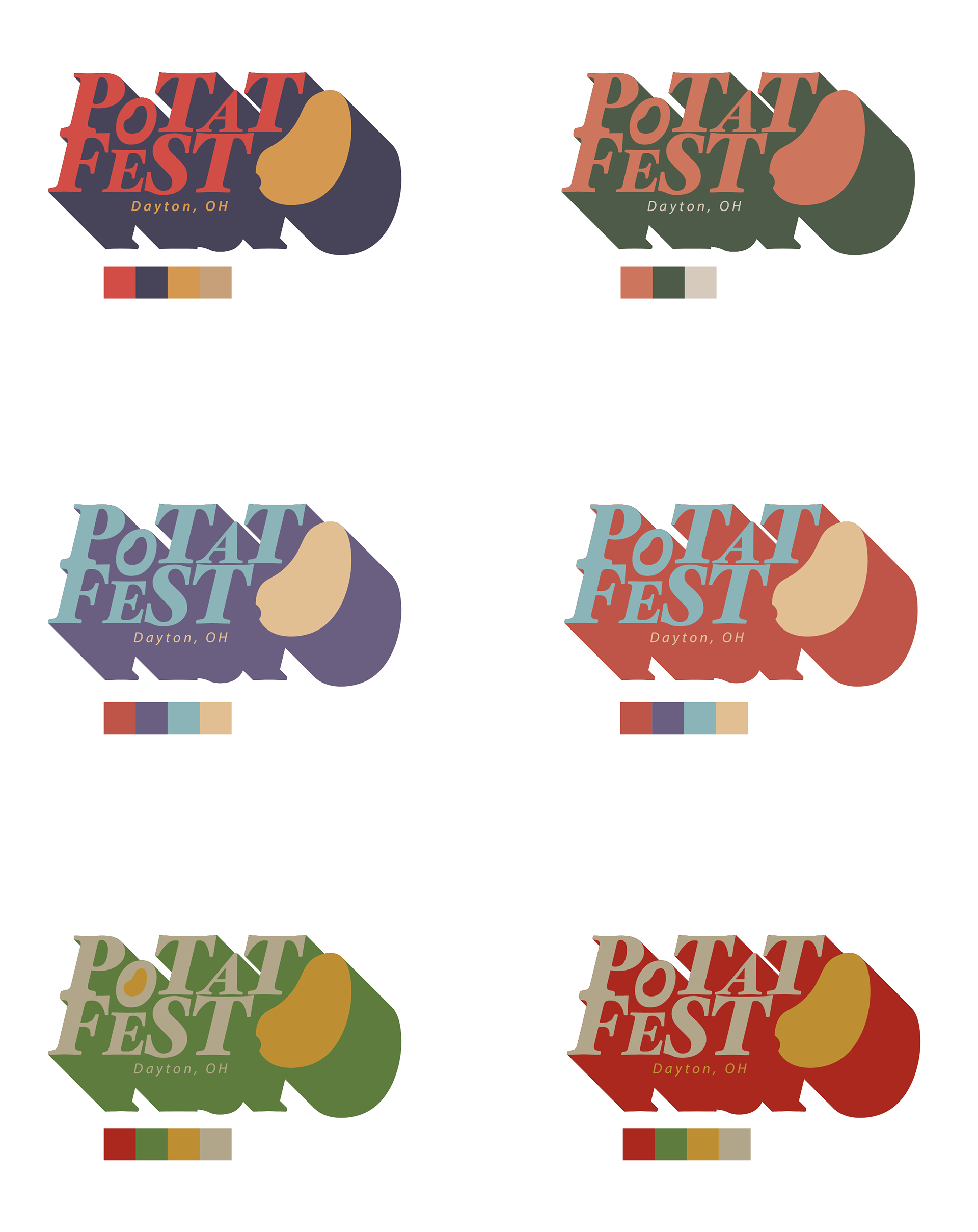 Entertainment - It's an 8 hour long community event with competitions, dancing, and live bands for the whole family.I tried to incorporate my 3 identified core values throughout my process. How do I visually show the familiarity and inclusion of a local event? How do I show the variety of potatoes? How do I make it fun and entertaining, something that the community and vendors will want to come back to every year?