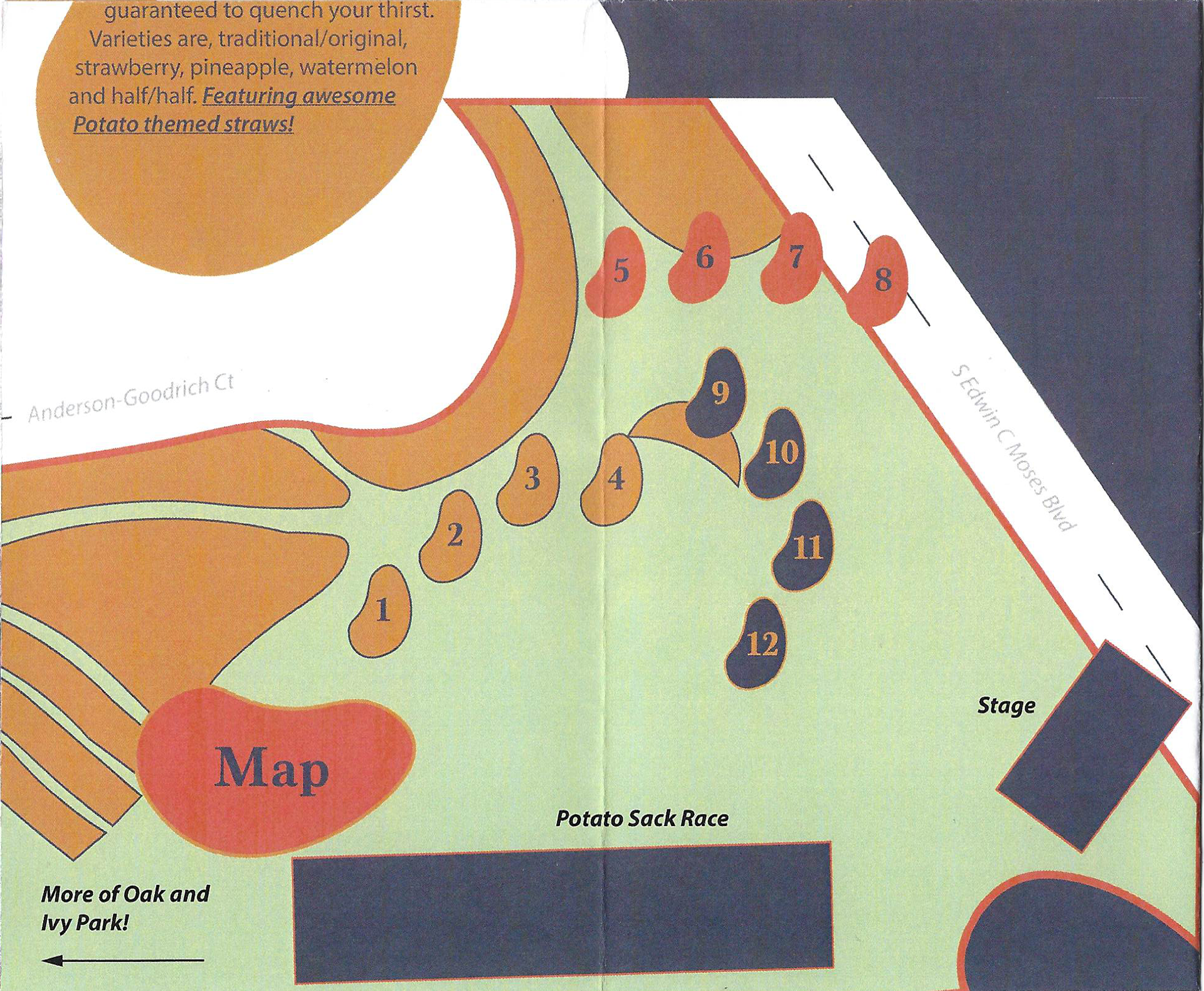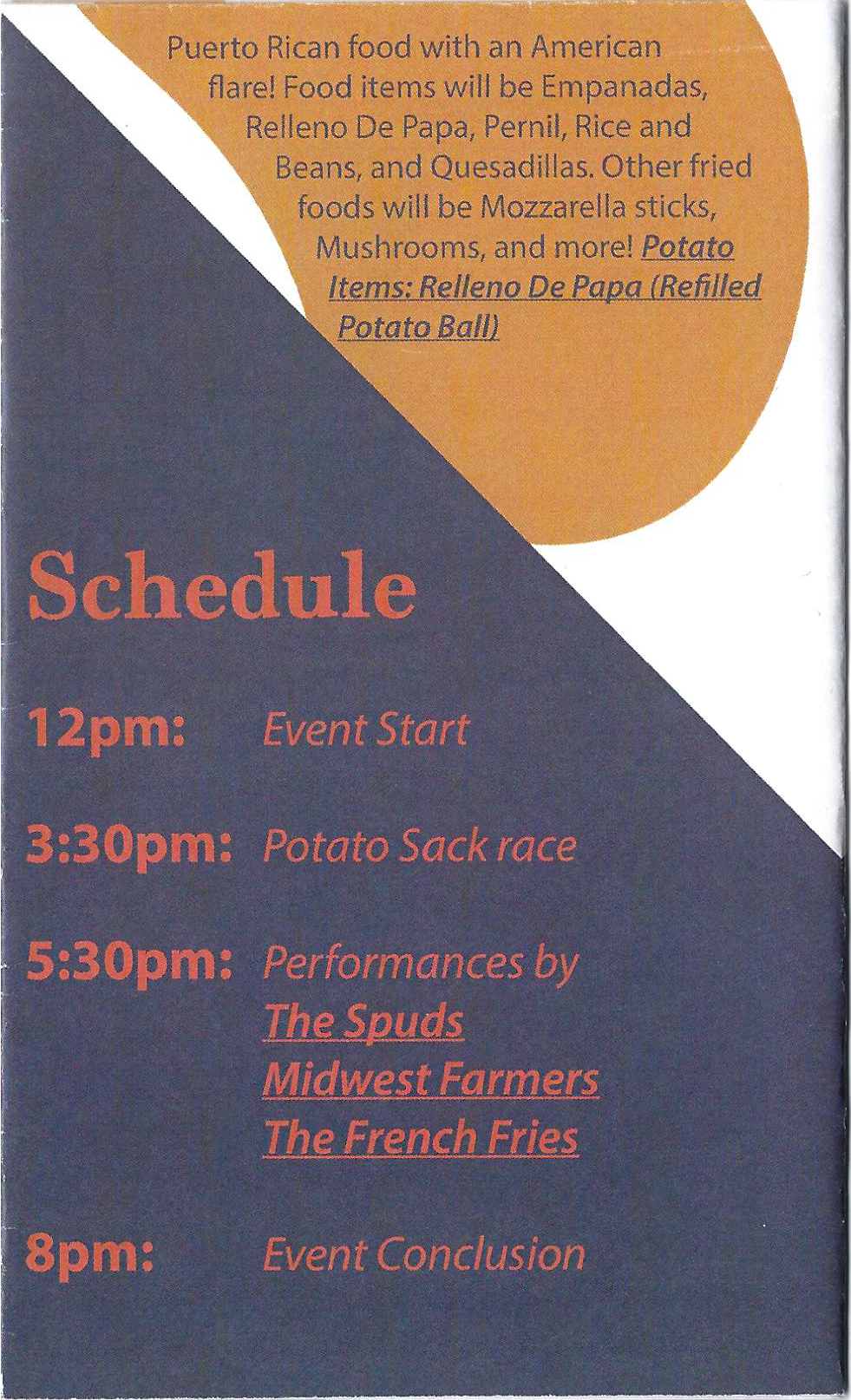 The current visual identity is inconsistent. There are a mix of colors over an almost full transparency background in the main advertising flyer, making it hard to read. Those colors are also different from the wordmark, which has potatoes underneath it. The wordmark itself sometimes has the potatoes, sometimes not, sometimes there’s an appearance of the Potato Mascot, sometimes not, sometimes the mascot is by itself.