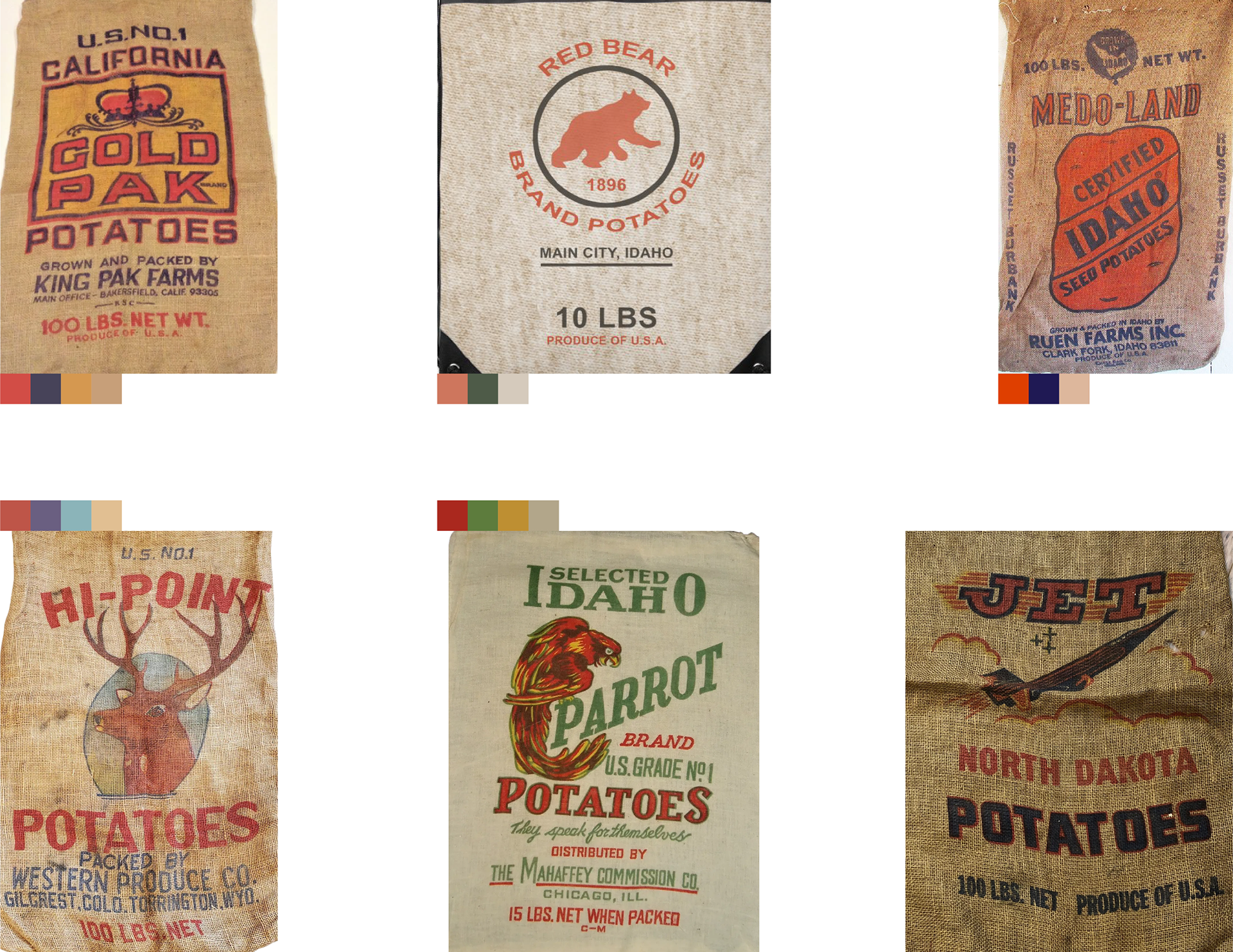 I drew inspiration from potato sacks I found online. I knew because of the color printing on the potato sack fabric, that the colors would have to be bold but still grounded, which is exactly what I was looking for. The bold colors give off the vibe of a fun family-friendly and community-orientated festival while still feeling grounded to a potato.