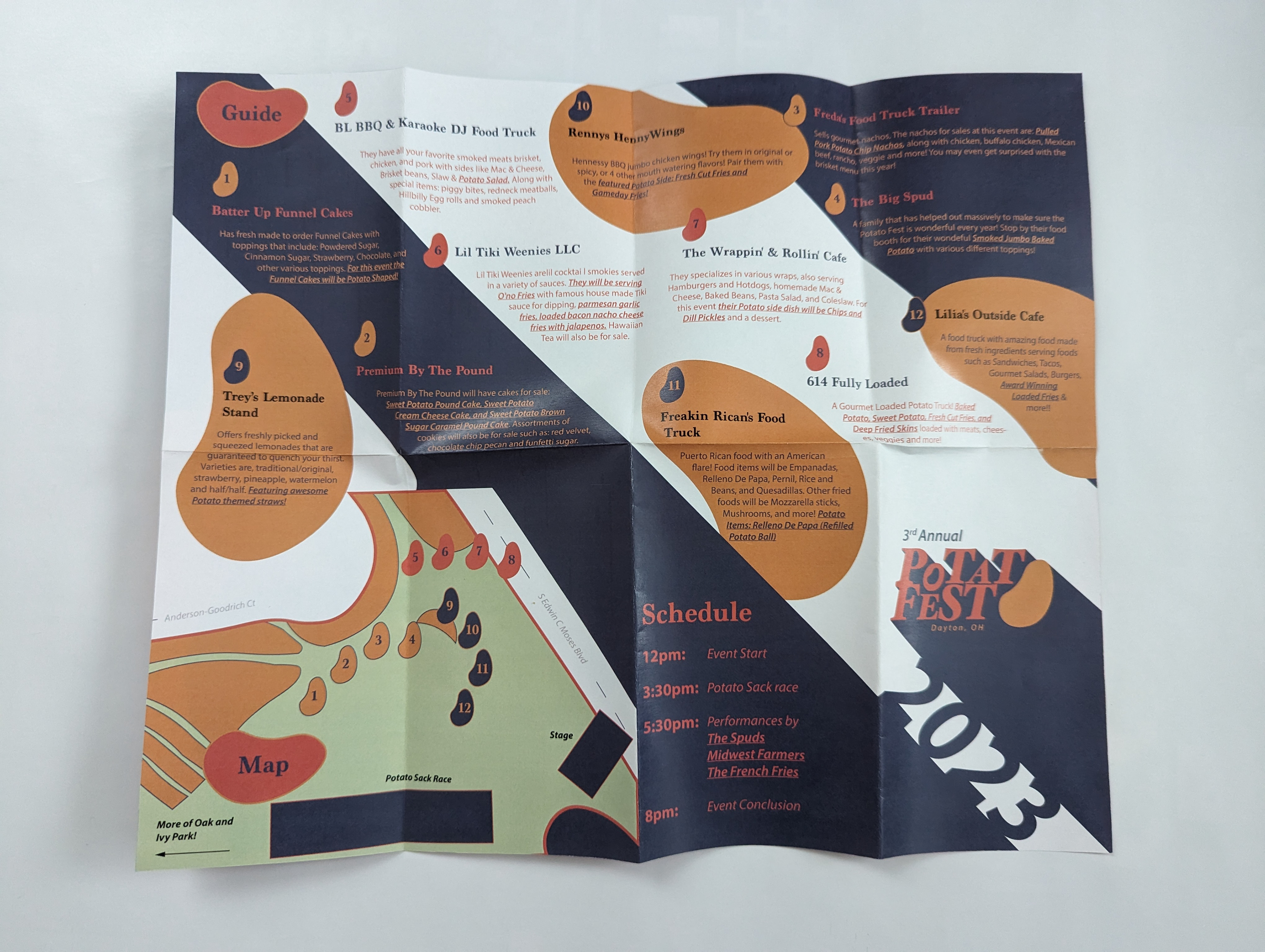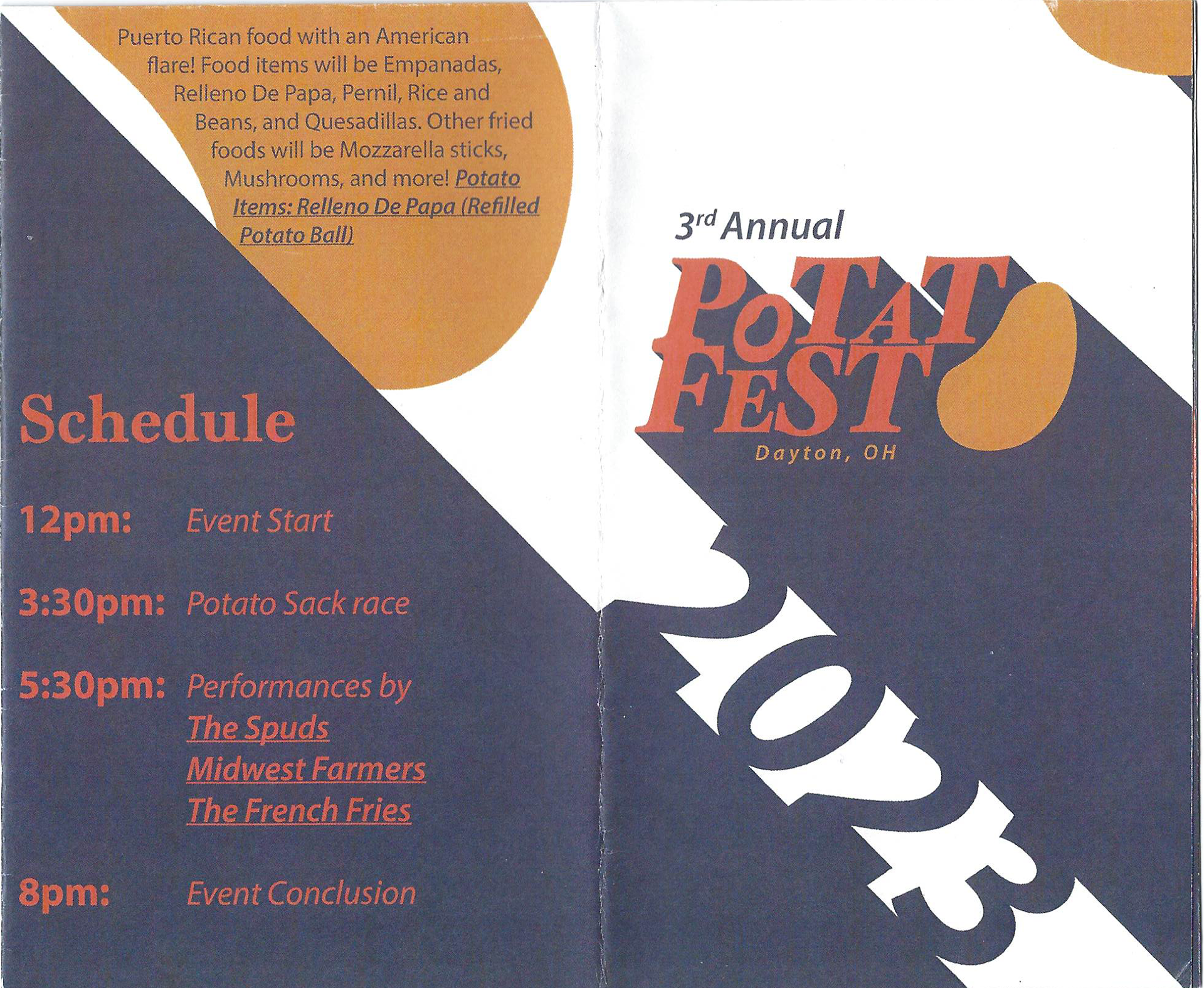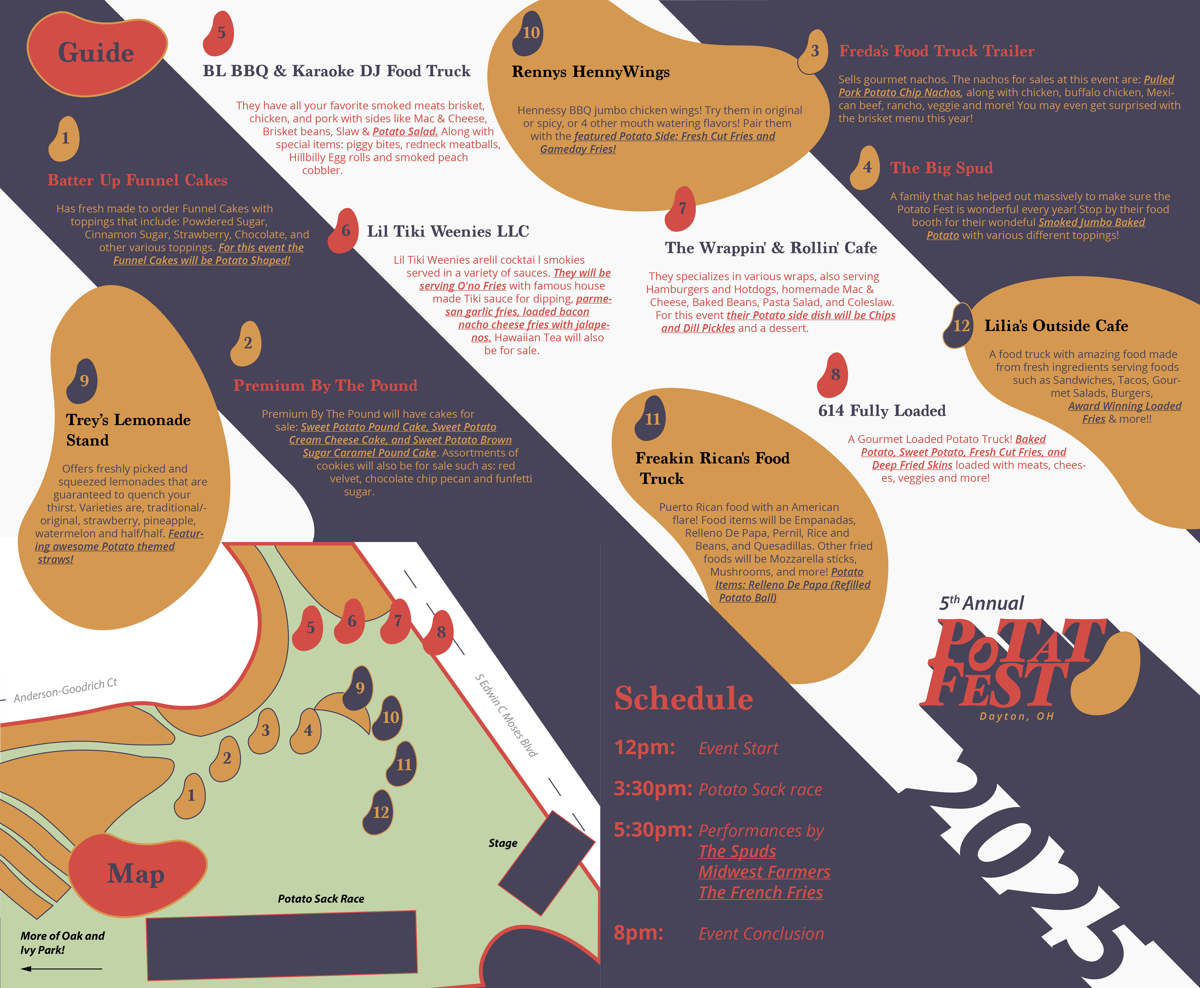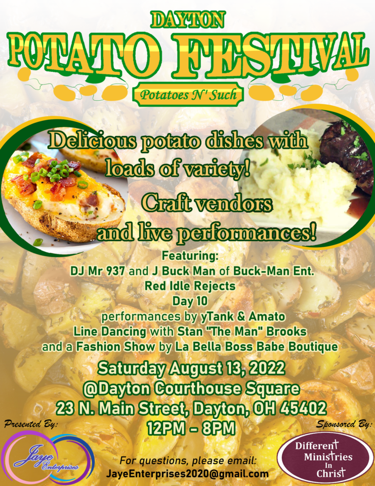 The Dayton Potato Fest is an annual festival held on the second weekend in August in the city of Dayton, OH since 2021 as a way to bring the city together after the pandemic. The festival is centered around potato dishes, food truck vendors, and different activities/entertainment to engage the community.