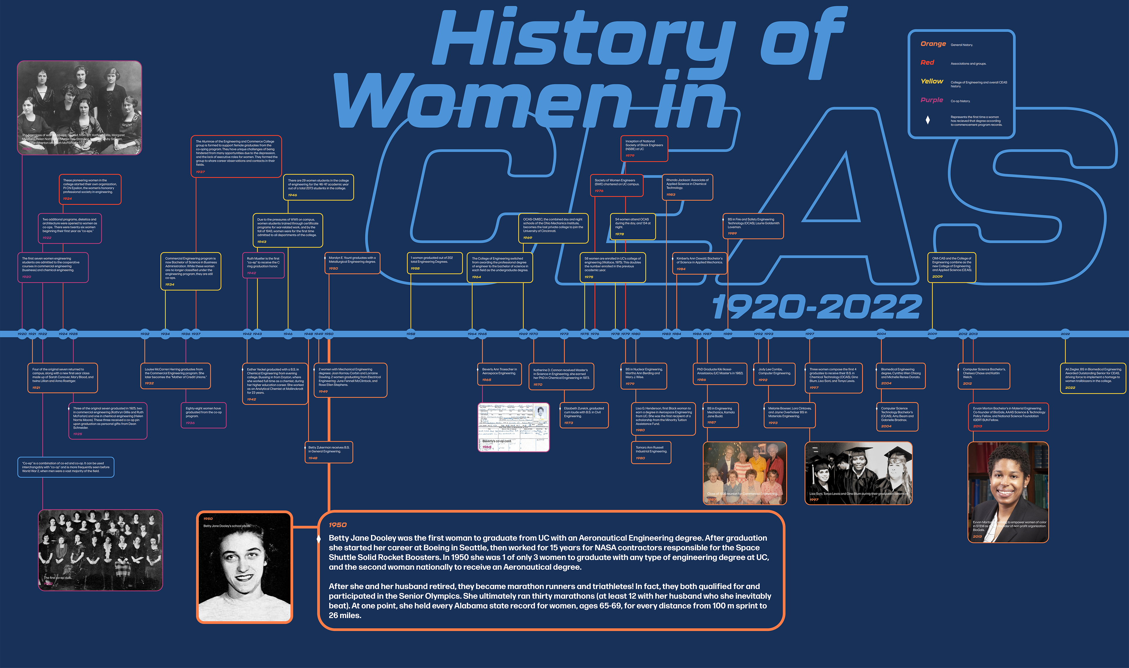 Provided with information from the Women in Engineering Trailblazers and the College of Engineering and Applied Sciences, I made a timeline of the History of Women in CEAS. The timeline covers significant events in the college, the formation of associations and groups, engineering co-op history, and the first time a woman has received that degree from 1920-2022.