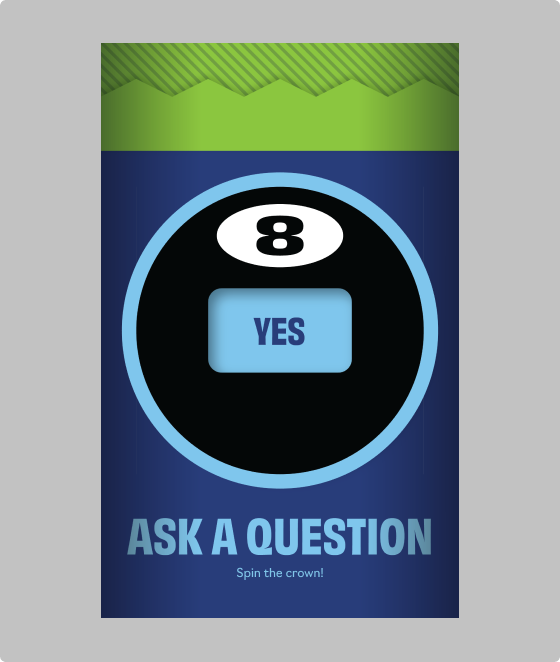 Our final graphics feature a fun and inspired set of facial features and crowns consistent with the rest of the visual identity. We made sure that no two features were too similar, allowing users up to 27 unique face combinations.