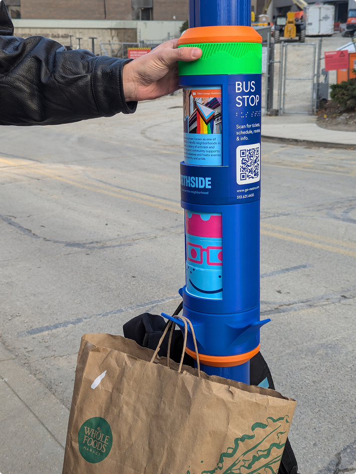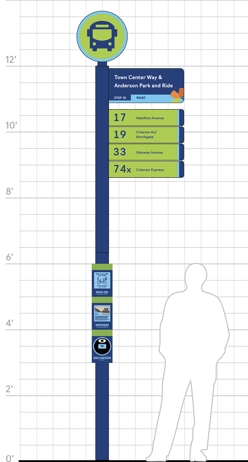 SORTA (Southwest Ohio Regional Transit Authority) and Metro (Southwest Ohio's bus system) are in the process of redesigning their bus stop poles for the Cincinnati area. They have collaborated with DAAP to bring our Collaborative Design class on what could potentially go on to those poles.