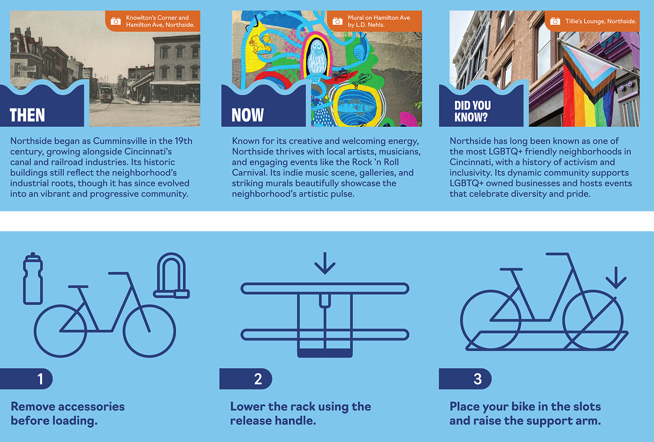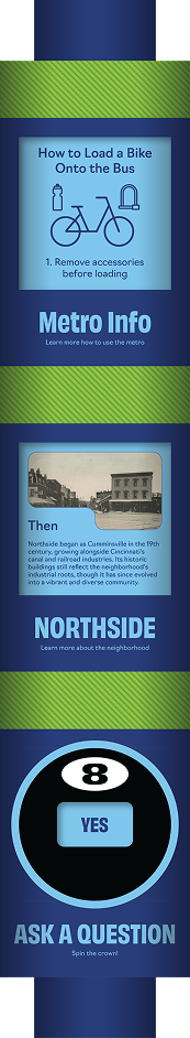We wanted to create a visual identity that was compatible with Metro, but also expanded upon their brand by adding elements that create a sense of culture and pride for the neighborhoods of Cincinnati.